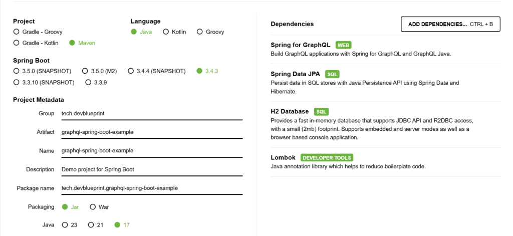Both the producer and consumer parts of our GraphQL project are created using Spring Initializr. For this example, we include the following dependencies: