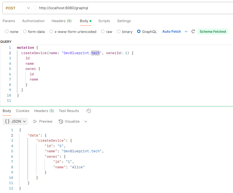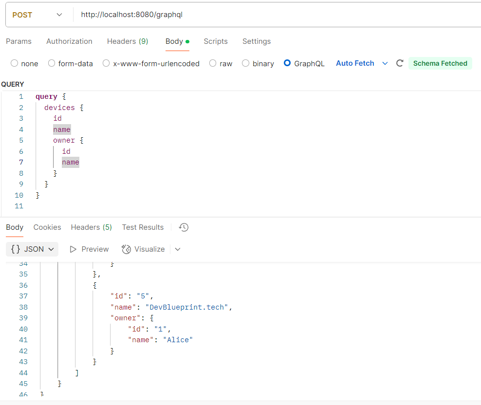 For example, a simple schema might define a Device and Owner type, along with queries to fetch them and mutations to create new ones. In our project, this is reflected in the code files such as:
